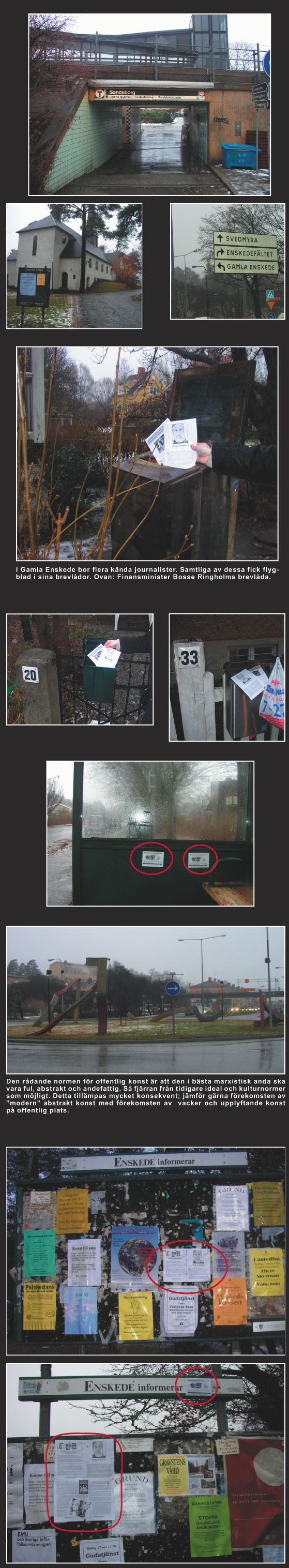 Större delen av Gamla Enskede täcktes med flygblad den 14 november. Omkring 1500 blad delades ut till hushållen av sympatisörer till Preservationist-Books.com.